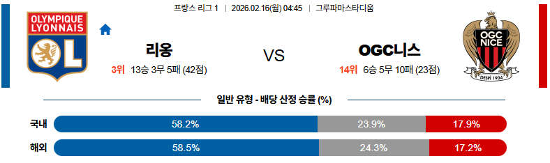 리옹 대 니스 리그앙 02월16일 맞대결 생중계, 스포츠중계, 스포츠분석