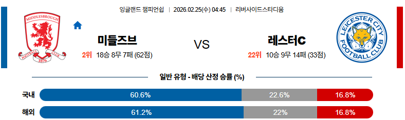미들즈브러 대 레스터시티 잉글랜드챔피언쉽 02월25일 맞대결 생중계, 스포츠중계, 스포츠분석