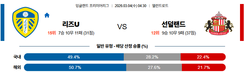 리즈 대 선더랜드 프리미어리그 03월04일 맞대결 생중계, 스포츠중계, 스포츠분석