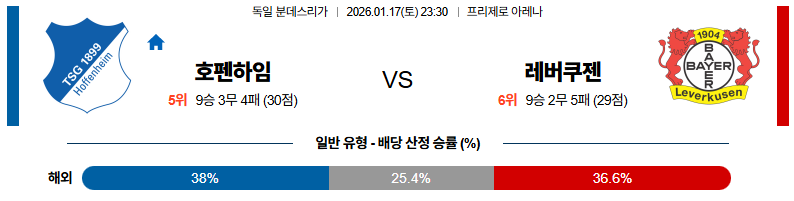 호펜하임 대 레버쿠젠 분데스리가 01월17일 맞대결 생중계, 스포츠중계, 스포츠분석