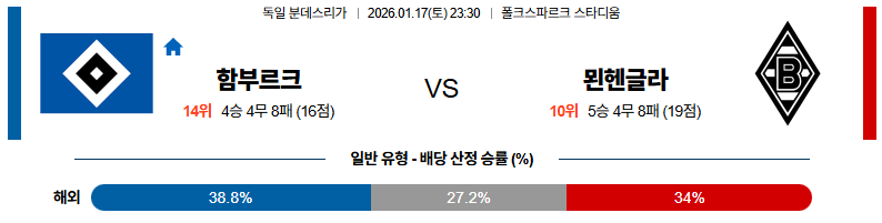 함부르크 대 묀헨글라트바흐 분데스리가 01월17일 맞대결 생중계, 스포츠중계, 스포츠분석