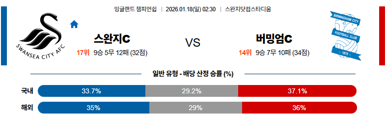 스완지시티 대 버밍엄시티 잉글랜드챔피언쉽 01월18일 맞대결 생중계, 스포츠중계, 스포츠분석