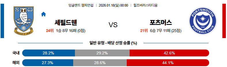 셰필드 웬즈데이는 시즌 전체 흐름에서 수비 조직과 팀 분위기가 무너진 상태여서 홈 경기에서도 안정감을 기대하기 어려운 상황입니다. 반면 포츠머스는 주축 선수들의 콤팩트한 전개와 후반 교체 카드까지 더해, 흐름을 잡으면 끝까지 밀어붙이는 패턴을 보여주고 있습니다. 따라서 이번 경기는 포츠머스가 원정에서도 승리를 가져갈 가능성이 높다고 판단됩니다.