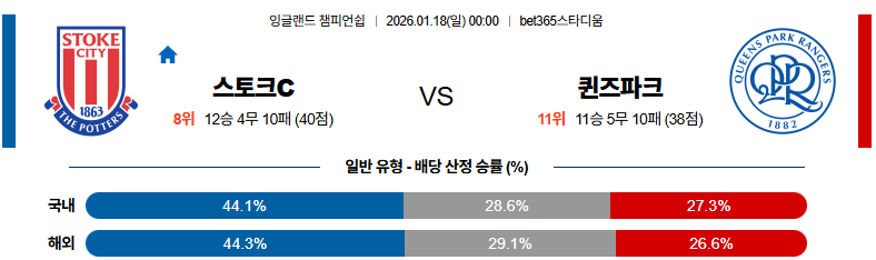 스토크시티 대 QPR 잉글랜드챔피언쉽 01월18일 맞대결 생중계, 스포츠중계, 스포츠분석