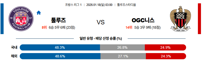 툴루즈 대 니스 리그앙 01월18일 맞대결 생중계, 스포츠중계, 스포츠분석