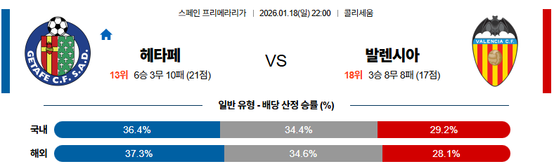 헤타페 대 발렌시아 라리가 01월18일 맞대결 생중계, 스포츠중계, 스포츠분석