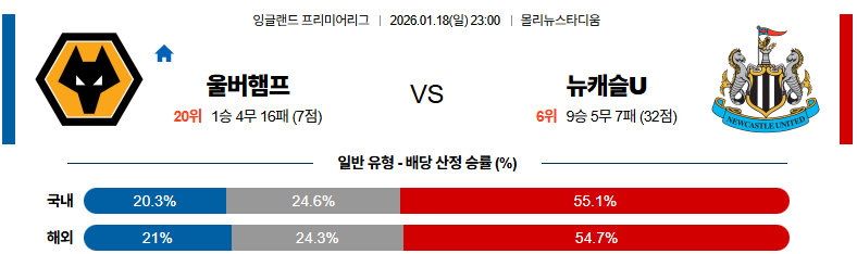울버햄튼은 아로코다레의 제공권과 황희찬의 침투를 통해 날카로운 역습을 시도할 수 있는 팀이지만, 수비 조직의 불안정함이 뉴캐슬의 공격을 90분 동안 막기에는 부담이 큽니다. 반면 뉴캐슬은 토날리가 템포를 조절하며 공격을 전개할 수 있는 구조를 갖추고 있어, 실점 리스크와 득점 기대값을 비교했을 때 뉴캐슬 승리에 무게를 두는 것이 합리적인 선택이 될 것입니다.