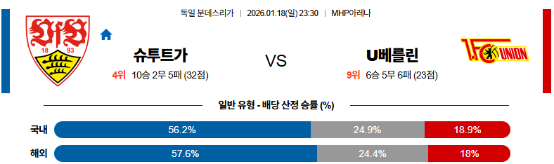 우니온베를린 대 슈투트가르트 분데스리가 01월18일 맞대결 생중계, 스포츠중계, 스포츠분석