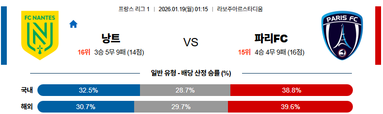 낭트 대 파리FC 리그앙 01월19일 맞대결 생중계, 스포츠중계, 스포츠분석