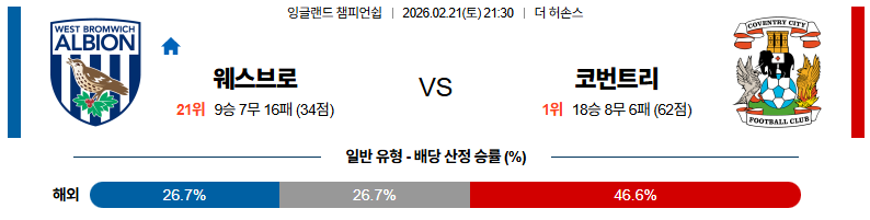웨스트브로미치 대 코번트리 잉글랜드챔피언쉽 02월21일 맞대결 생중계, 스포츠중계, 스포츠분석