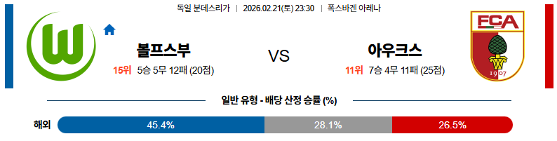 볼프스부르크 대 아우크스부르크 분데스리가 02월21일 맞대결 생중계, 스포츠중계, 스포츠분석