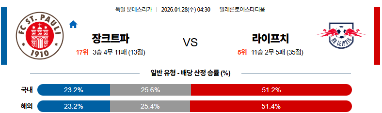 라이프치히의 적극적인 템포 조절과 장크트파울리의 느린 방향 전환이 맞붙는 경기로, 라이프치히가 우세할 것으로 보입니다.