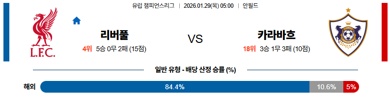 이 경기는 리버풀이 홈에서 공격 템포를 끌어올리며 경기를 주도하고, 카라바흐는 장거리 원정 피로와 수비 라인 불안으로 인해 버티기만 해도 벅찰 가능성이 높습니다. 따라서 실제 베팅 관점에서는 리버풀 승리를 기본 전제로 하되, 득점이 많이 나올 수 있는 흐름에 초점을 맞춰 언더오버 시장을 적극 활용하는 전략이 더 합리적입니다. 장거리 이동과 전력 차이, 그리고 라인 브레이킹 패스에 취약한 카라바흐 수비 구조를 고려할 때, 이번 경기는 리버풀이 확실히 스코어를 가져갈 수 있는 경기로 해석하는 것이 설득력이 높습니다.