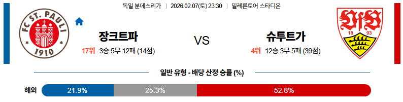 장크트파울리 대 슈투트가르트 분데스리가 02월07일 맞대결 생중계, 스포츠중계, 스포츠분석