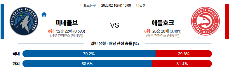 미네소타 대 애틀랜타 NBA 02월10일 맞대결 생중계, 스포츠중계, 스포츠분석