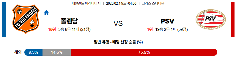폴랜담 대 아인트호벤 에레디비지에 02월14일 맞대결 생중계, 스포츠중계, 스포츠분석