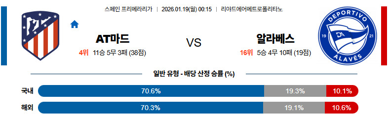 AT마드리드가 볼 주변에서 수적 우위를 만드는 구조를 통해 점유율을 끌어올릴 가능성이 높으며, 알라베스는 역습 한 방을 노리겠지만, 전체적으로 수비 시간이 길어질 수밖에 없는 흐름입니다. 따라서 AT마드리드가 승리할 것으로 예상됩니다.