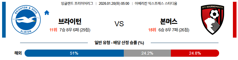 브라이튼의 콤팩트한 전방 연계와 측면 돌파가 본머스의 허술한 수비 라인을 얼마나 효율적으로 찢어내느냐의 싸움으로, 브라이튼이 우위를 점할 가능성이 높습니다. 본머스의 수비 조직력과 멘탈이 흔들릴 경우, 브라이튼의 추가 득점 가능성이 더욱 높아질 것입니다.