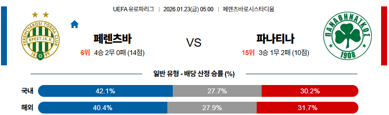 페렌츠바로시 대 파나시나이코스 UEFA유로파리그 01월23일 맞대결 생중계, 스포츠중계, 스포츠분석