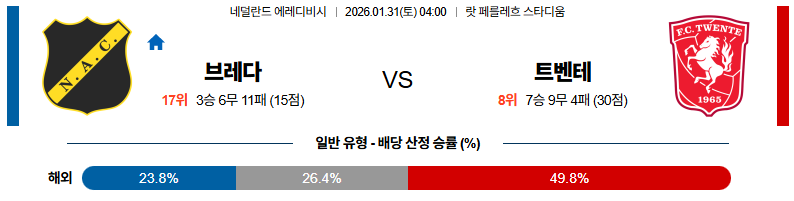 트벤테 대 브레다 에레디비지 01월31일 맞대결 생중계, 스포츠중계, 스포츠분석