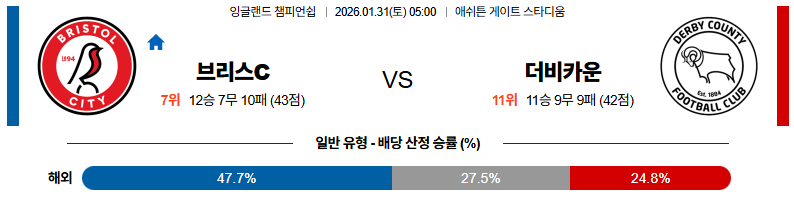 브리스톨 대 더비카운티 잉글랜드챔피언쉽 01월31일 맞대결 생중계, 스포츠중계, 스포츠분석