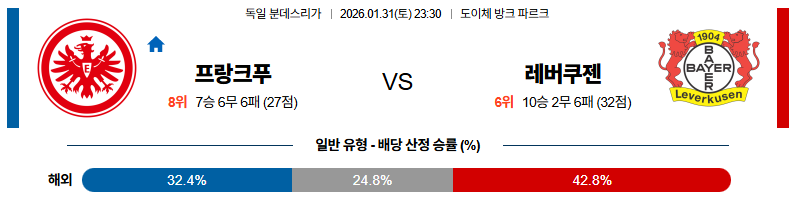 프랑크푸르트의 공격적인 전방 압박과 레버쿠젠의 느린 후방 빌드업이 충돌하는 매치업으로, 프랑크푸르트가 이길 가능성이 높습니다.