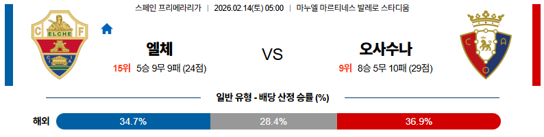 엘체 대 오사수나 라리가 02월14일 맞대결 생중계, 스포츠중계, 스포츠분석